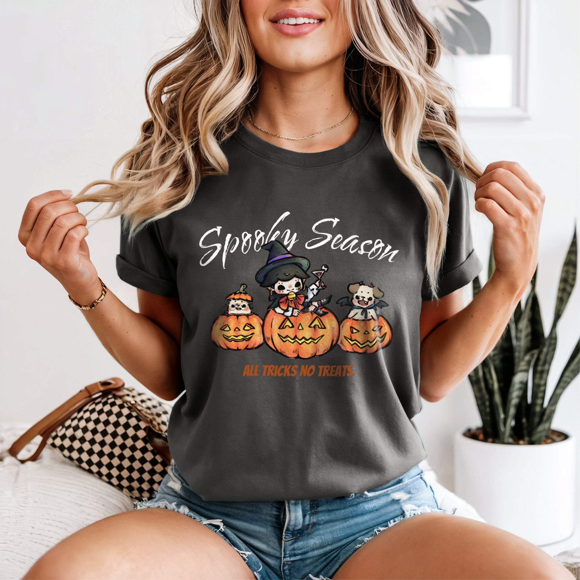 This collection is inspired by classic Halloween scenes and atmosphere. Whether it's the warm glow of jack-o'-lanterns, witches sweeping across the night sky on flying brooms, figures dressed in skeleton costumes, or the lively moments of trick-or-treating, these festive and dramatic elements subtly shape our daily moods and rhythms. Wear these designs and carry a different Halloween creative scene with you each day. This t-shirt becomes your canvas of seasonal inspiration, adding a touch of "trick or treat" to your everyday style. Let your wardrobe feel playful and inspired throughout the spooky season.